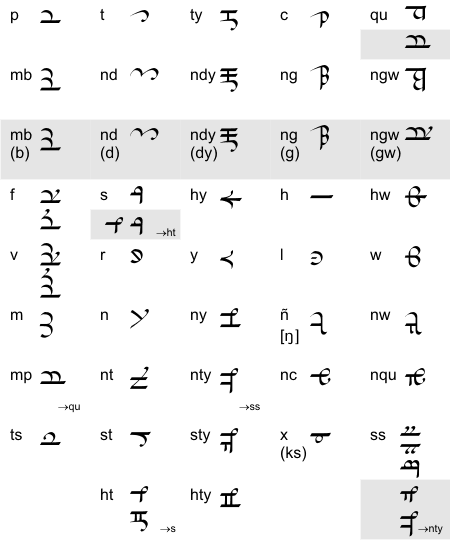 据 R15,代表 mb、nd、ndy、ng、ngw 的字母仅在“单独书写”(即前面不直接连接其他辅音)时表示这些音值。当作为辅音簇的一部分书写时,这些字母取较短的音值 b、d、dy、g、gw。由于 R17 中没有对应昆雅语辅音簇(如 ld、rd)的字母,此处描述的规则可能同样适用于该体系。