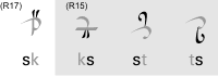 R15 中(该文献省略了代表 ts、x、st 等特殊组合的萨拉提),短线可见于萨拉提的前方与后方,分别代表前接与后接 s。该文献亦将蜷曲线列为替代符号。