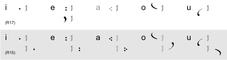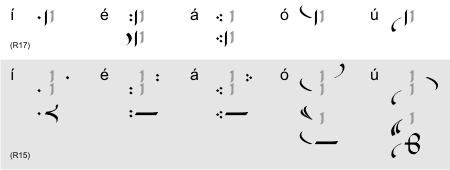 据 R15,长元音有多种标示方式。标准方法是重复元音附加符号:第一个符号置于前一辅音底部,第二个符号置于后一辅音顶部。然而,长元音 ó 和 ú “通常”通过在后一辅音顶部使用双重附加符号表示。 此外,长音 í 可写作 iy,长音 ú 可写作 uw,而 é、á、ó 可写作 eh、ah、oh。后一种体系在单音节词中属于常规,对 í、é、á 更是“强制”使用;在多音节词中则被视为“古体”。