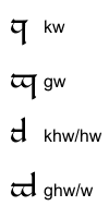 辛达语的若干辅音簇中存在后接 w,但这些音中仅有 gw 和 hw 在该表中列出,所列的其余音值则根本不见于辛达语。可能该表仅为理论构建,AppE 用以展示唇化音系列最具系统性的布局,而非实际使用。多数后接 w 需要以“变体 u 弧”书写(hw 可能写作 hwesta sindarinwa,见上文)。gw 音也可能类比 dw 和 rw 的写法,使用 tehta 表示,而非为减轻记忆负担采用单一滕格瓦。