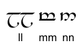 在我们所见的贝烈瑞安德模式样本中,有例证的长辅音或双写辅音仅有 ll、mm、nn。长 l 写作两个相邻的 lambe,与拉丁转写形式相仿。长 m 和 n 则分别写作 malta 和 númen。后两者无疑是 vala 与 óre 的双写的简写形式——这两个滕格瓦是本模式中 m 和 n 的标准符号。可以推断,所有其他长辅音皆以双写滕格瓦表示。