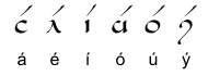 本模式中,长元音通过在上方叠加“锐音符”表示,“这种情况下称为 andaith‘长标号’”[AppE]。通常推测托尔金以扬抑符标记的“特别延长”的元音与普通长元音未作区分,但这纯属猜测。它们也可能以双写 andaith 等方式标记。各长元音列于图 2。