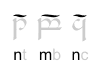 AppE指出,“横杠(或类似西班牙语中的波浪号)置于辅音字母上方,常常表示该辅音前有出自同一系列的鼻音(如 nt、mp 或 nk)”——该鼻音是 m 还是 n 取决于该滕格瓦在表中的位置。DTS 8 证实贝烈瑞安德模式中有鼻化 tehta。在松散复合词中,若前一词以鼻音结尾且与后一词的词首辅音部位相同,显然更倾向将两音分离,写成两个滕格瓦。DTS 21 便暗示了这一点:单词 palan-díriel(连字符在滕格瓦书写中无对应符号)中的 n 写为 óre。