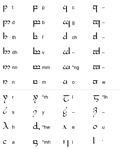 图 1 展示了贝烈瑞安德模式中的滕格瓦音值,依照《魔戒》的惯例转录。无例证的音值标有星号(*)。关于辛达语发音,见 AppE。注解列于下文。点击图中单个滕格瓦即可跳转至相关注解。