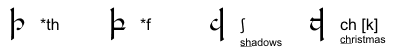 图 3 列出了英语音位拼写中滕格瓦的音值。每个转写的滕格瓦至少附有一个使用该字母的例词,例词中与其对应的拉丁字母加有下划线。转写带星号(*)的滕格瓦尚无例证。