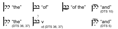 简写形式用于常见英语单词 the、of、of the、and。the 和 of 的简写基于系列 IV的延长形式。在表示 of 的滕格瓦下方加横线则表示 of the。