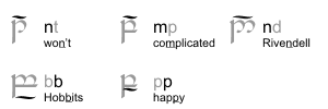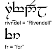 and 的简写通过省略该词的元音符号实现。托尔金在 AppE 中将包含下侧圆点的简写描述为表示“非重读的” and。