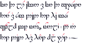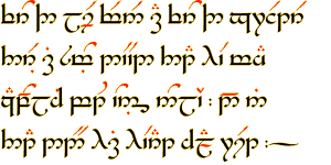 当然,并不存在一种专门表示英语的“模式”。从费艾诺系统中完全可以设计出一套语音上足够精确的模式,但书名页上的简短例子[DTS 5]并没有企图展示这种模式。它其实是这样一个例子:刚铎的人类在推敲过他所熟悉的字母音值“模式”和英语传统拼写之后,最后创造出的写法可能就是这样。[AppE]