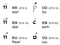 图 4 列出了所使用的元音符号。每个转写的 tehta 至少附有一个使用该元音符号的例词,例词中与其对应的拉丁字母加有下划线。