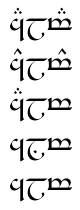 昆雅语的长元音(拉丁转写中以锐音符标示)“通常用置于‘长载体’(常见形状如同不加点的 j)上的 tehta 来表示,但也可用用双写 tehta 来达到同样目的。但是,只有弧常常这样写,有时‘锐音符’也这样写”[AppE]。在DTS 55中,只要前方有滕格瓦可用,除 á 外的所有长元音均一致以双写 tehta 表示。甚至 í 也用两点表示,尽管有间接评论指出这并非通行做法。表示长音 í 的双写 tehta 在 DTS 62 中亦有例证。图 3 展示了已知的长元音标示方法。
