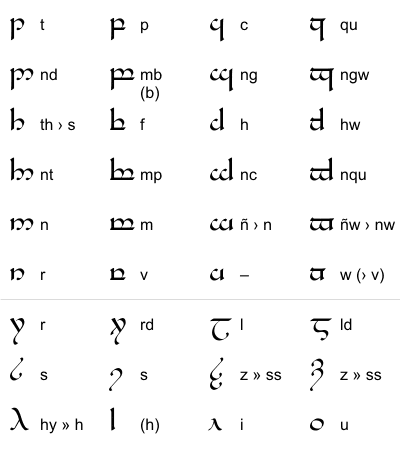 说明:下文常以昆雅语名称指代各个滕格瓦字母。完整列表请参阅滕格瓦名称一文。