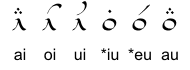 昆雅语的二合元音包括 ai、oi、ui、iu、eu、au。它们原本均为下降二合元音,即重音落在第一个元音上。在《Namárie》手写稿中,每个二合元音的第一个元音由元音 tehta 表示,第二个元音则由滕格瓦表示。若第二个元音为 i,以 yanta 表示;若为 u,则以 úre 表示。二合元音列表见图 5。尚无例证的二合元音在图中标以星号。