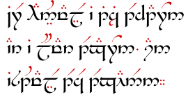至第三纪元,“R 在所有位置均代表颤音 r”[ibid.],且这个颤音 r 常写作 rómen。在《Namárie》手写稿中óre 用于辅音前及词尾的 r,而 rómen 用于元音前的 r(仅有一处例外见于DTS 55,单词 ómaryo 用了 óre,可能出于笔误)。这种对 r 符号的区分可能是出于美学考量,而非实际表示发音差异。据 OP,诺多族倾向以 óre 表示原本的颤音 r,“但博学之士视此为谬误”。